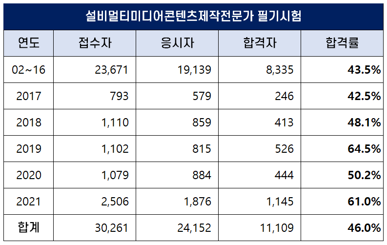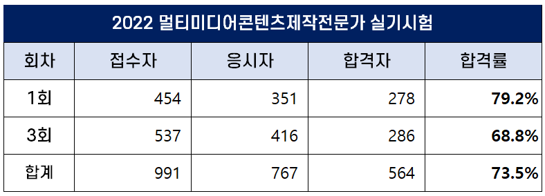 이번 포스팅에서는 2022년에 시행된 1회, 3회 멀티미디어콘텐츠제작전문가 필기 및 실기 시험 원서접수인원, 응시인원, 합격인원 및 합격률에 대해 정리했습니다.