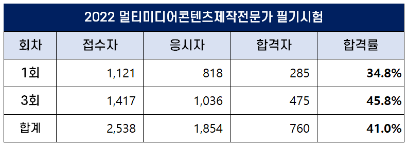 아래 표에서 보는 것처럼 2022년 멀티미디어콘텐츠제작전문가 필기시험에는 총 2,538명이 원서접수를 했는데요. 이 중 1,854명이 필기시험에 응시했고 760명이 합격을 해 평균 합격률은 41.0%입니다.