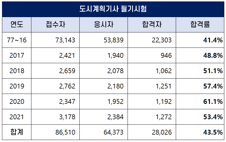아래표는 도시계획기사 자격시험이 처음 시행된 1977년부터 2021년까지 역대 도시계획기사 필기시험 합격률인데요. 평균 합격률은 43.5%입니다.