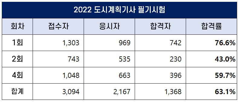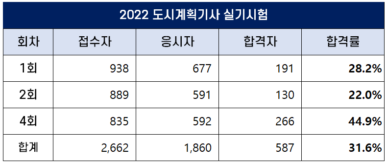 이번 포스팅에서는 2022년에 시행된 1회, 2회, 4회 도시계획기사 필기 및 실기 시험 원서접수인원, 응시인원, 합격인원 및 합격률에 대해 정리했습니다.