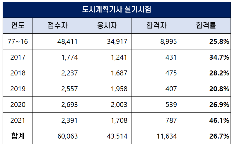 1977년부터 2021년까지 역대 도시계획기사 실기 평균 합격률은 26.7%인데요. 2020년에는 46.1%의 높은 합격률을 기록하기도 했습니다.