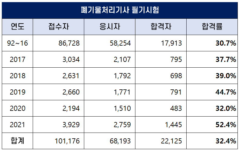 아래 표는 폐기물처리기사 자격시험이 처음 시행된 1992년부터 2021년까지 역대 폐기물처리기사 필기시험 합격률인데요. 평균 합격률은 32.4%이나 2021년에는 52.4%의 높은 합격률을 기록했습니다.