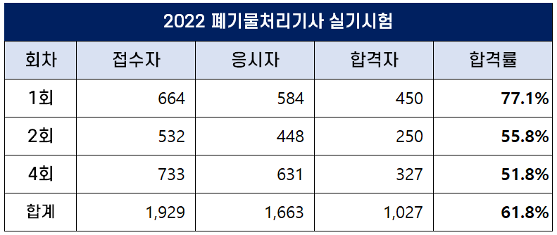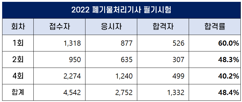 이번 포스팅에서는 2022년에 시행된 1회, 2회, 4회 폐기물처리기사 필기 및 실기 시험 원서접수인원, 응시인원, 합격인원 및 합격률에 대해 정리했습니다.
