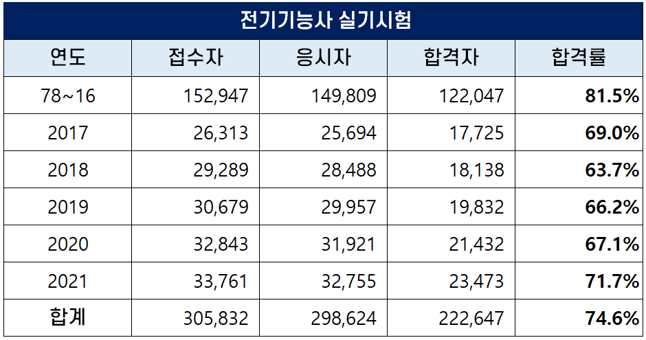 1978년부터 2021년까지 역대 전기기능사 실기 평균 합격률은 74.6%인데요. 최근 5년간은 합격률이 낮아져 2018년에는 63.7%의 낮은 합격률을 기록하기도 했습니다.