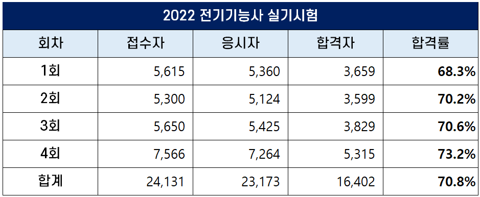 2022년 4회 전기기능사 실기 시험은 7,264명의 응시자 중 5,315명이 합격해 73.2%의 합격률을 기록했고, 2022년 실기 평균 합격률은 70.8%입니다.