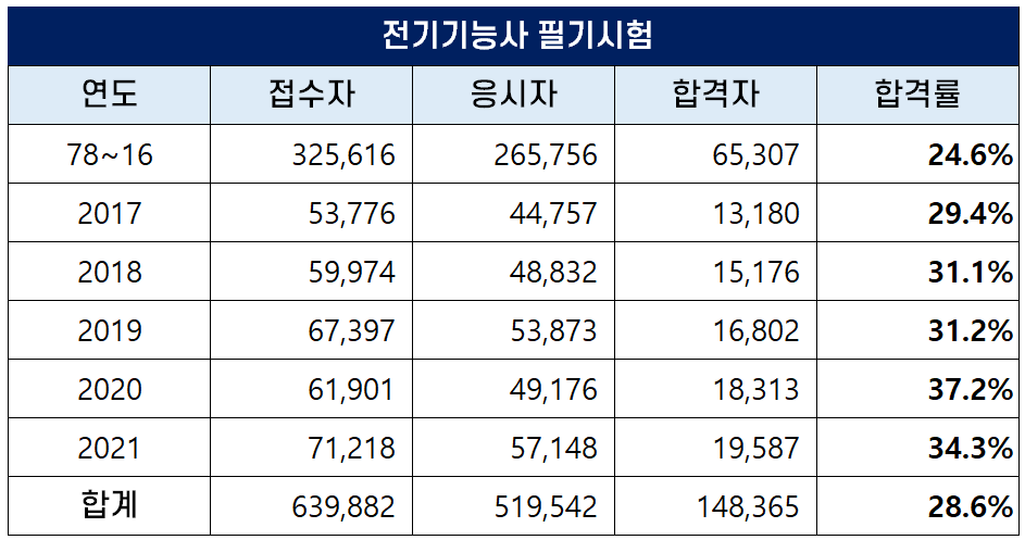 아래 표는 전기기능사 자격시험이 처음 시행된 1978년부터 2021년까지 역대 전기기능사 필기시험 접수자, 응시자, 합격자 및 합격률 현황인데요. 평균 필기 합격률은 28.6%이나 2020년에는 37.2%의 높은 합격률을 기록하기도 했습니다.