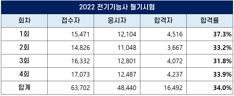 2022년 전기기능사 필기시험에는 총 63,702명이 원서접수를 했는데 이 중 48,440명이 응시해 16,492명이 합격했고, 34.0%의 합격률을 기록했습니다.