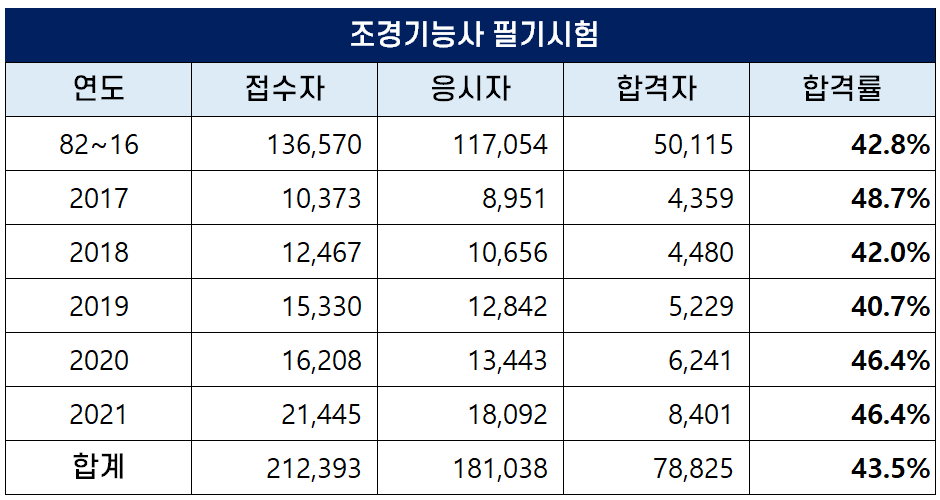 아래 표는 조경기능사 자격시험이 처음 시행된 1982년부터 2021년까지 역대 조경기능사 필기시험 접수자, 응시자, 합격자 및 합격률 현황인데요. 평균 필기 합격률은 43.5%입니다.