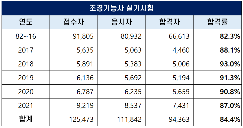 1982년부터 2021년까지 역대 조경기능사 실기 평균 합격률은 84.4%로 높은 편입니다.