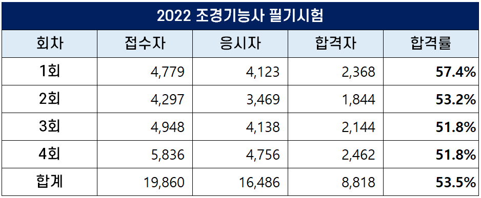2022년 조경기능사 필기시험에는 총 19,860명이 원서접수를 했는데요. 이 중 16,486명이 응시했고 8,818명이 합격을 해 합격률은 53.5%를 기록했습니다.