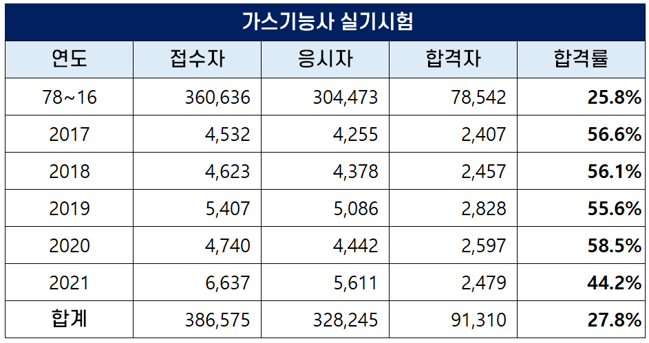 아래 표는가스기능사 자격시험이 처음 시행된 1978년부터 2021년까지 역대 가스기능사 필기시험 접수자, 응시자, 합격자 및 합격률 현황인데요. 평균 필기 합격률은 29.9%입니다.