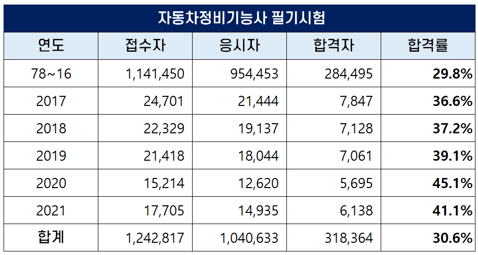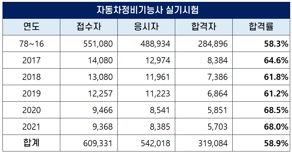 1978년부터 2021년까지 역대 자동차정비기능사 실기 평균 합격률은 58.9%인데요. 최근 5년간은 합격률이 높아져 2020년에는 68.5%의 높은 합격률을 기록하기도 했습니다.