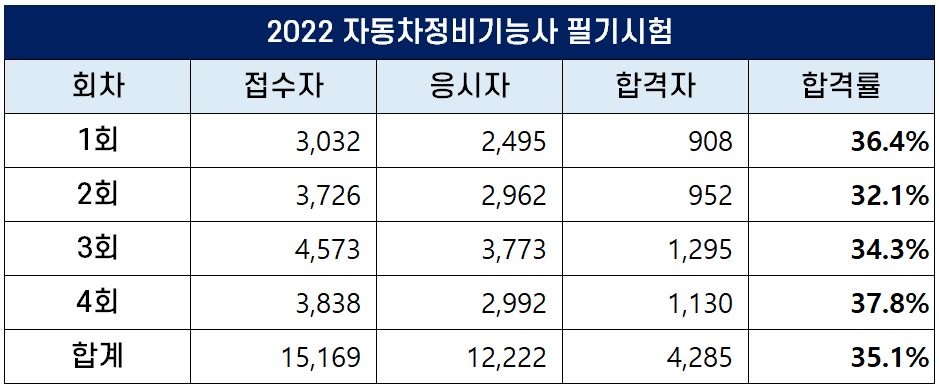 2022년 자동차정비기능사 필기시험에는 총 15,169명이 원서접수를 했는데요. 이 중 12,222명이 응시해 4,285명이 합격했고, 합격률은 35.1%입니다.