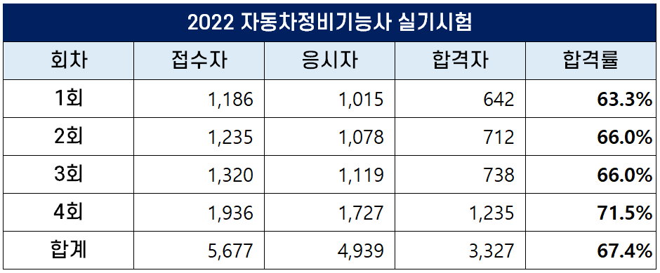 이번 포스팅에서는 2022년에 시행된 1회, 2회, 3회, 4회 자동차정비기능사 필기 및 실기 시험 원서접수자, 응시자, 합격자 및 합격률에 대해 정리했습니다.
