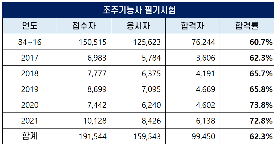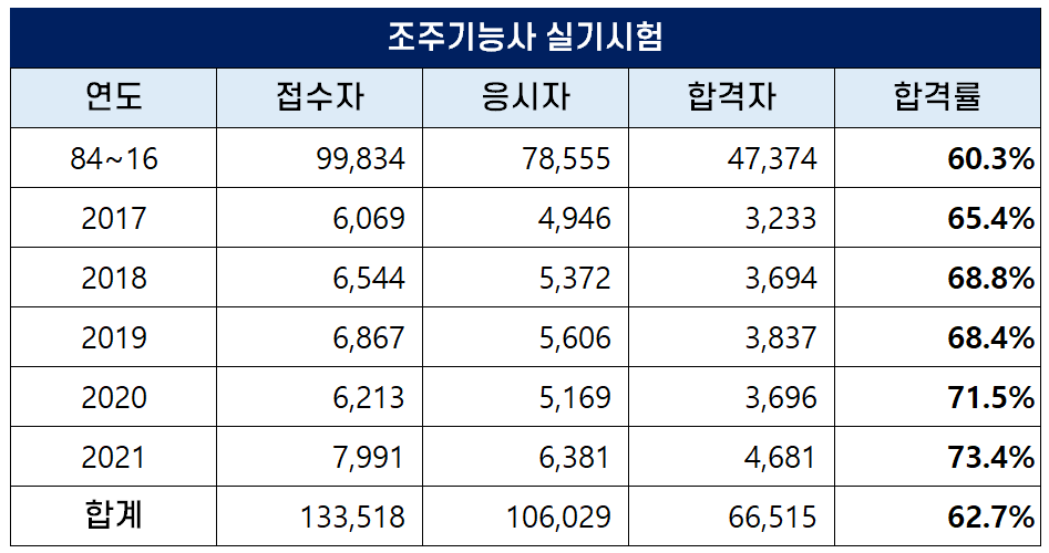 1984년부터 2021년까지 역대 조주기능사 실기 평균 합격률은 62.7%인데요. 2021년에는 73.4%의 높은 합격률을 기록했습니다.