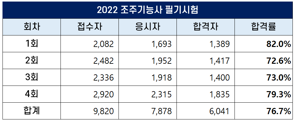 2022년 조주기능사 필기시험에는 총 9,820명이 원서접수를 했는데요. 이 중 7,878명이 응시해 6,041명이 합격했고, 합격률은 76.7%입니다.