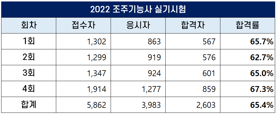 이번 포스팅에서는 2022년에 시행된 1회, 2회, 3회, 4회 조주기능사 필기 및 실기 시험 원서접수자, 응시자, 합격자 및 합격률에 대해 정리했습니다.