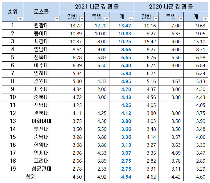 2021년 로스쿨 입시 나군 경쟁률에서도 원광대가 13.47대 1의 경쟁률을 기록하며 1위를 기록했습니다. 10.83대 1의 경쟁률을 보인 동아대가 2위, 10.25대 경쟁률을 보인 서강대가 3위, 8.66대 1의 경쟁률을 보인 영남대가 4위, 6.65대 1의 경쟁률을 보인 전북대가 5위입니다.