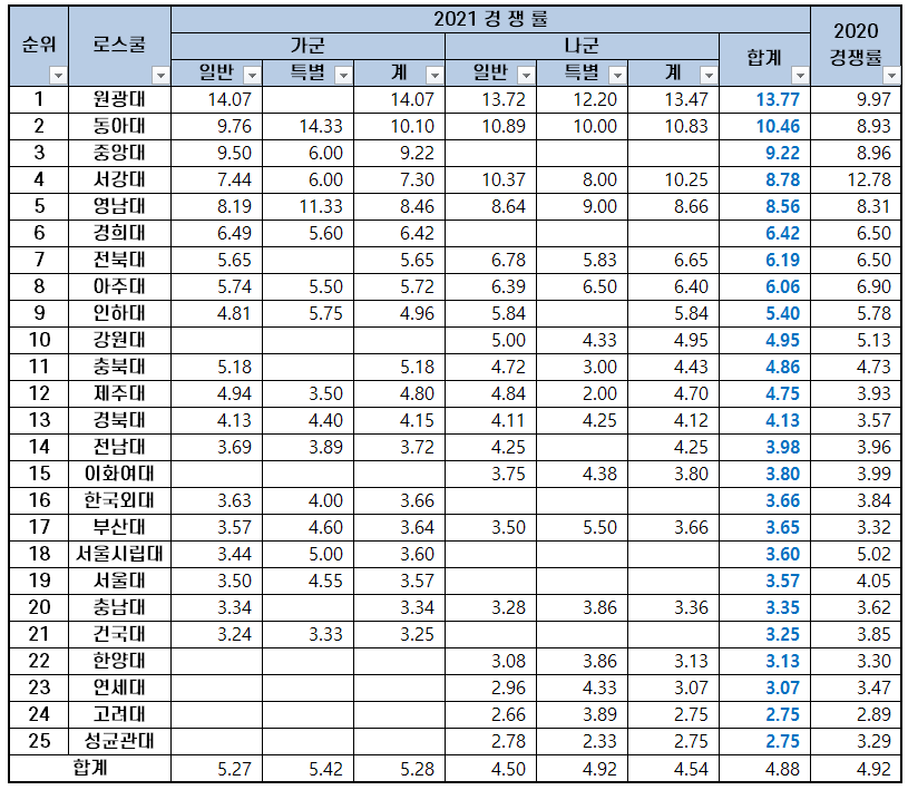 2021년 25개 로스쿨의 평균 입학 경쟁률은 4.88대 1로 2020년 경쟁률 4.92대 1보다 소폭 하락했습니다. 가군 로스쿨의 평균 경쟁률은 5.28대 1로, 4.54대 1의 평균 경쟁률을 기록한 나군 로스쿨보다 높았습니다.