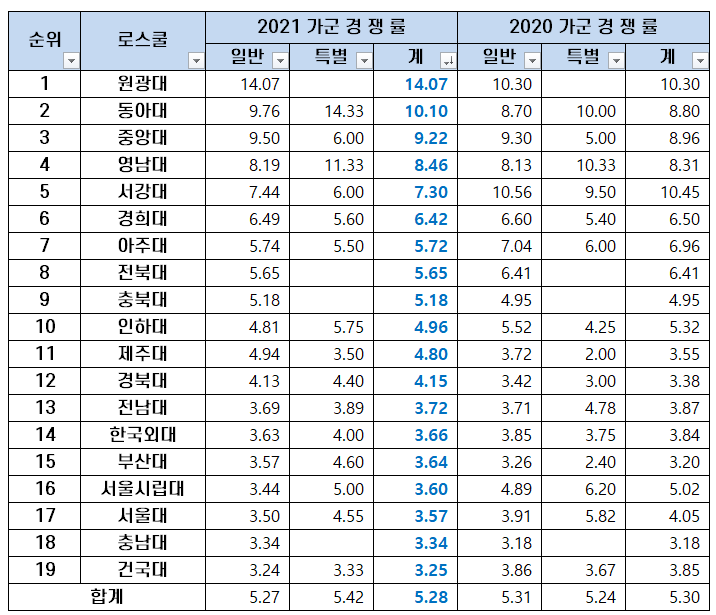 2021년 로스쿨 입시 가군 경쟁률 순위