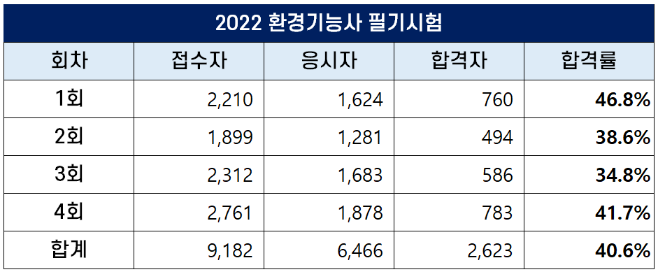 2022년 환경기능사 필기시험에는 총 9,182명이 원서접수를 했는데요. 이 중 6,466명이 응시해 2,623명이 합격했고, 합격률은 40.36%를 기록했습니다.