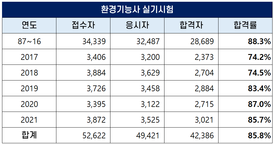 이번 포스팅에서는 2022년에 시행된 1회, 2회, 3회, 4회 환경기능사 필기 및 실기 시험 원서접수자, 응시자, 합격자 및 합격률에 대해 정리했습니다.