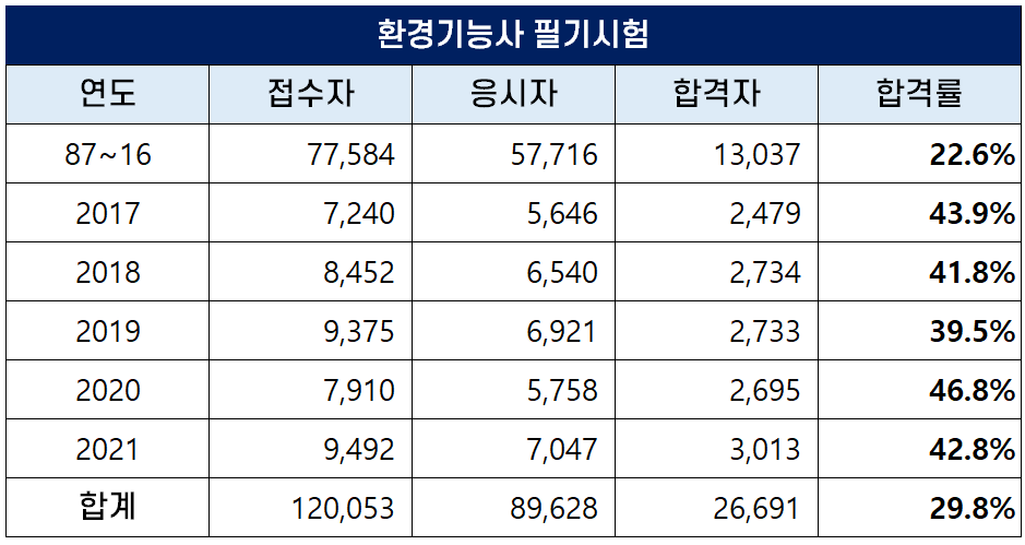 아래 표는 환경기능사 자격시험이 처음 시행된 1987년부터 2021년까지 역대 환경기능사 필기시험 접수자, 응시자, 합격자 및 합격률 현황인데요. 평균 필기 합격률은 29.8%이나 2020년에는 46.8%의 높은 합격률을 기록하기도 했습니다.