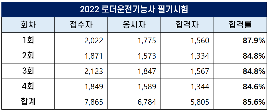 2022년 로더운전기능사 필기시험에는 총 7,865명이 원서접수를 했는데요. 이 중 6,784명이 응시해 5,805명이 합격했고 합격률은 85.6%입니다.