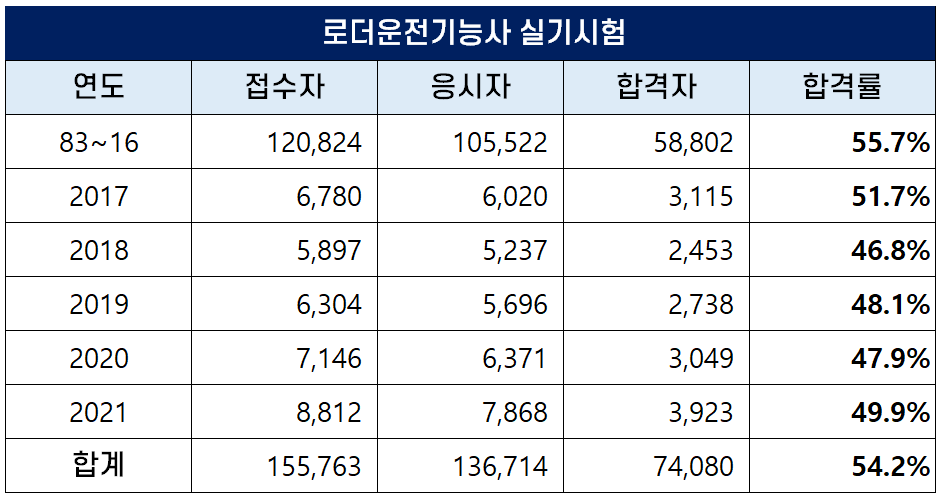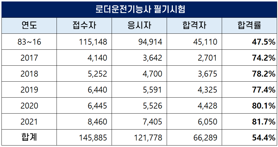 아래 표는 로더운전기능사 자격시험이 처음 시행된 1983년부터 2021년까지 역대 로더운전기능사 필기시험 접수자, 응시자, 합격자 및 합격률 현황인데요. 평균 필기 합격률은 54.5%이나 최근 합격률이 높아져 2021년에는 81.7%의 높은 합격률을 기록하기도 했습니다.