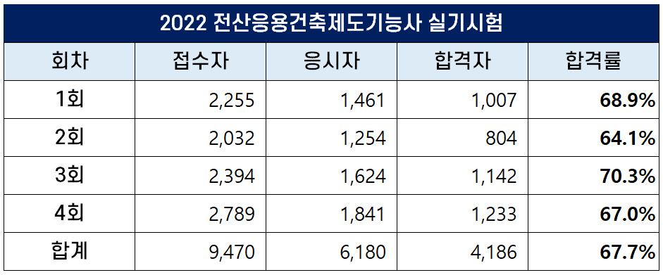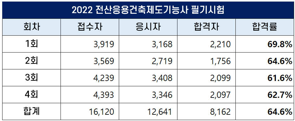 이번 포스팅에서는 2022년에 시행된 1회, 2회, 3회, 4회 전산응용건축제도기능사 필기 및 실기 시험 원서접수자, 응시자, 합격자 및 합격률에 대해 정리했습니다.