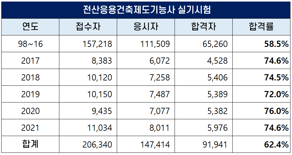 1998년부터 2021년까지 역대 전산응용건축제도기능사 실기 평균 합격률은 62.4%인데요. 최근에는 합격률이 높아져 70%대의 합격률을 유지하고 있습니다.