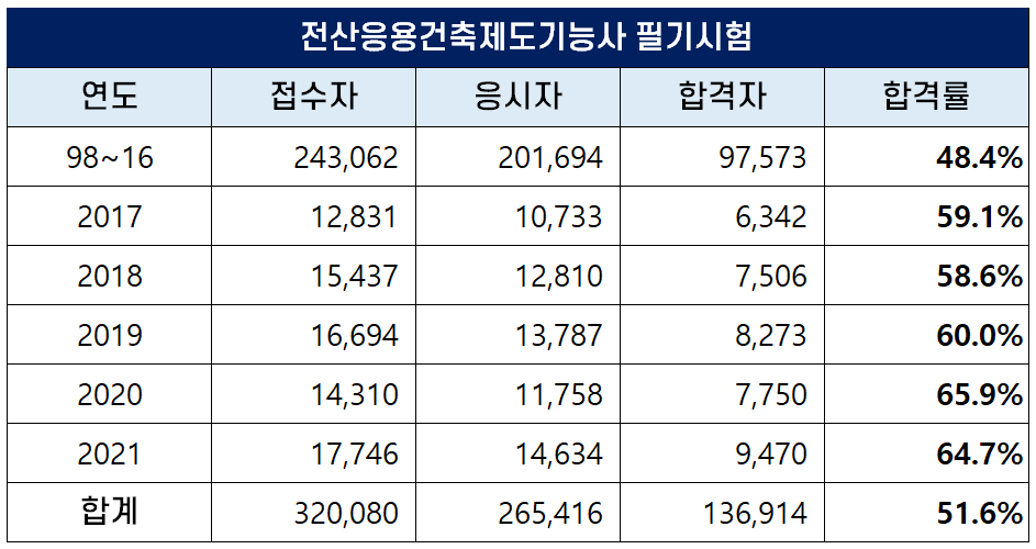 아래 표는 전산응용건축제도기능사 자격시험이 처음 시행된 1998년부터 2021년까지 역대 전산응용건축제도기능사 필기시험 접수자, 응시자, 합격자 및 합격률 현황인데요. 평균 필기 합격률은 51.6%이나 최근 합격률이 높아져 2021년에는 65.9%의 합격률을 기록하기도 했습니다.
