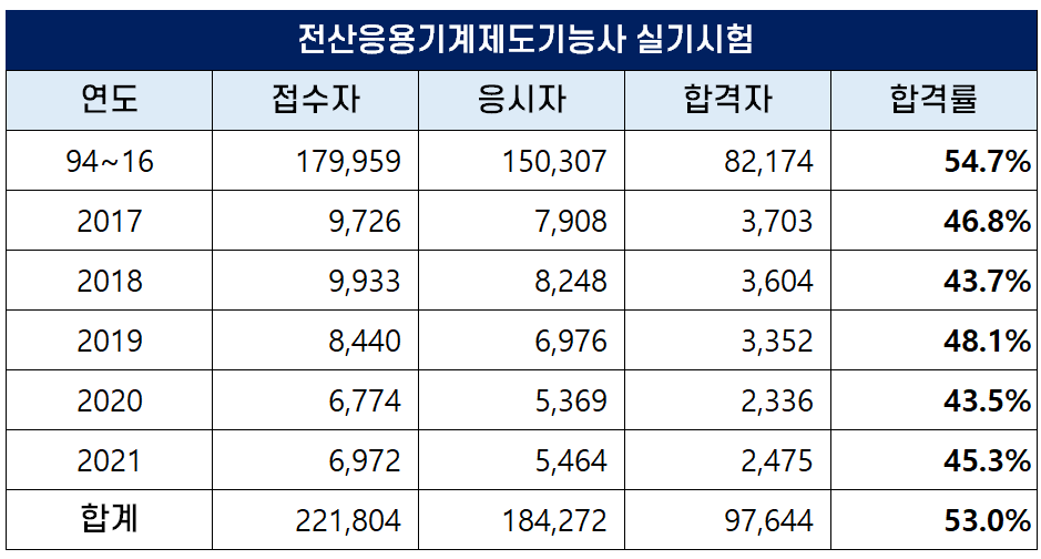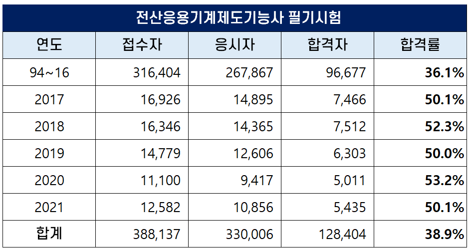 아래 표는 전산응용기계제도기능사 자격시험이 처음 시행된 1994년부터 2021년까지 역대 전산응용기계제도기능사 필기시험 접수자, 응시자, 합격자 및 합격률 현황인데요. 평균 필기 합격률은 38.9%이나 최근 합격률이 높아져 50%대의 합격률을 유지하고 있습니다.