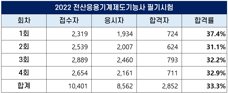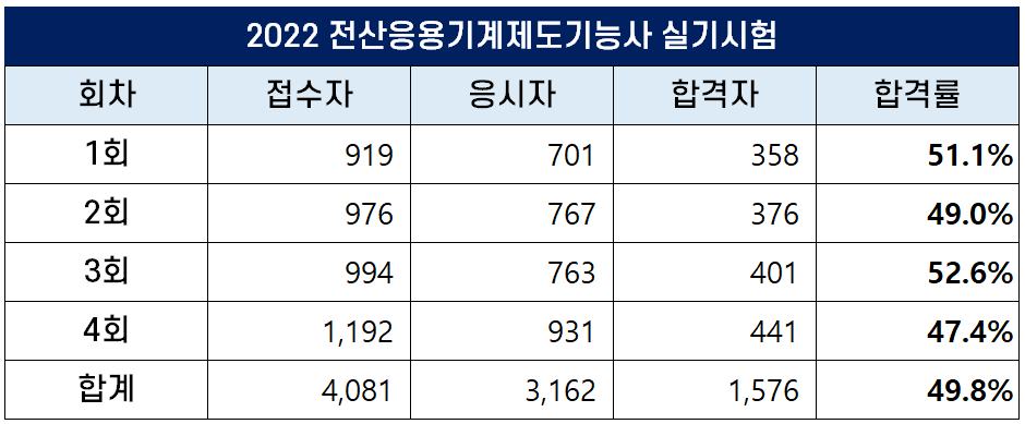 이번 포스팅에서는 2022년에 시행된 1회, 2회, 3회, 4회 전산응용기계제도기능사 필기 및 실기 시험 원서접수자, 응시자, 합격자 및 합격률에 대해 정리했습니다.
