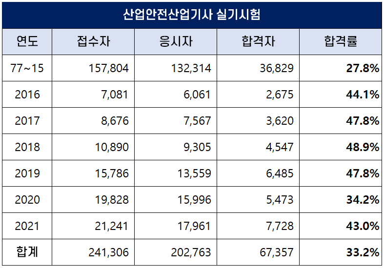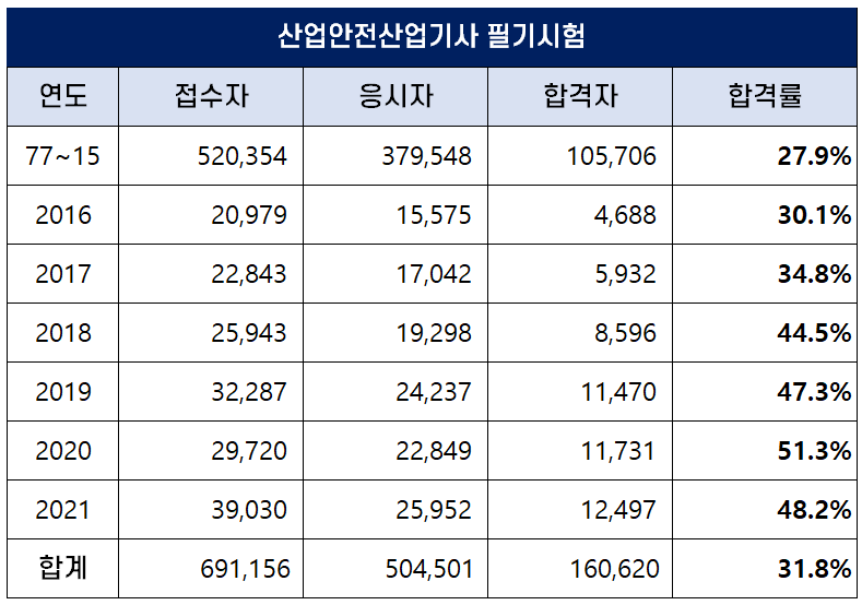 아래 표는 산업안전산업기사 자격시험이 처음 시행된 1977년부터 2021년까지 역대 산업안전산업기사 필기시험 접수자, 응시자, 합격자 및 합격률 현황인데요. 평균 필기 합격률은 31.8%이나 최근 합격률이 높아져 2020년에는 51.3%의 높은 합격률을 기록하기도 했습니다.