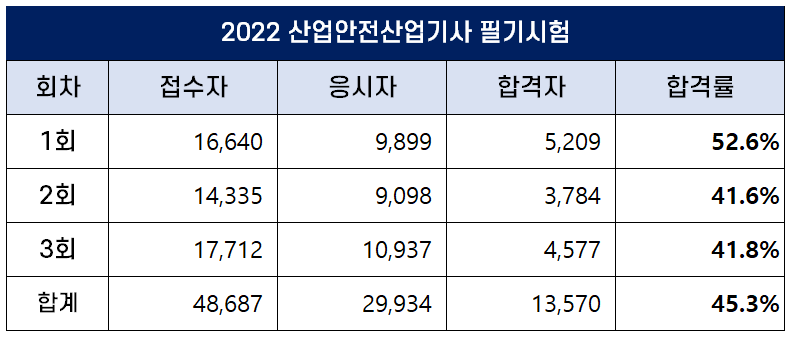 아래 표에서 보는 것처럼 2022년 산업안전산업기사 필기시험에는 총 48,687명이 원서접수를 했는데요. 이 중 29,934명이 필기시험에 응시했고 13,570명이 합격을 해 평균 합격률은 45.3%입니다.
