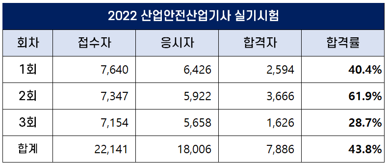 2022년 3회 산업안전산업기사 실기 합격률은 28.7%이고, 2022년 평균 합격률은 43.8%입니다.