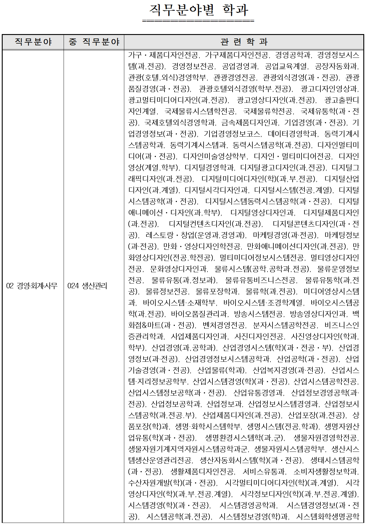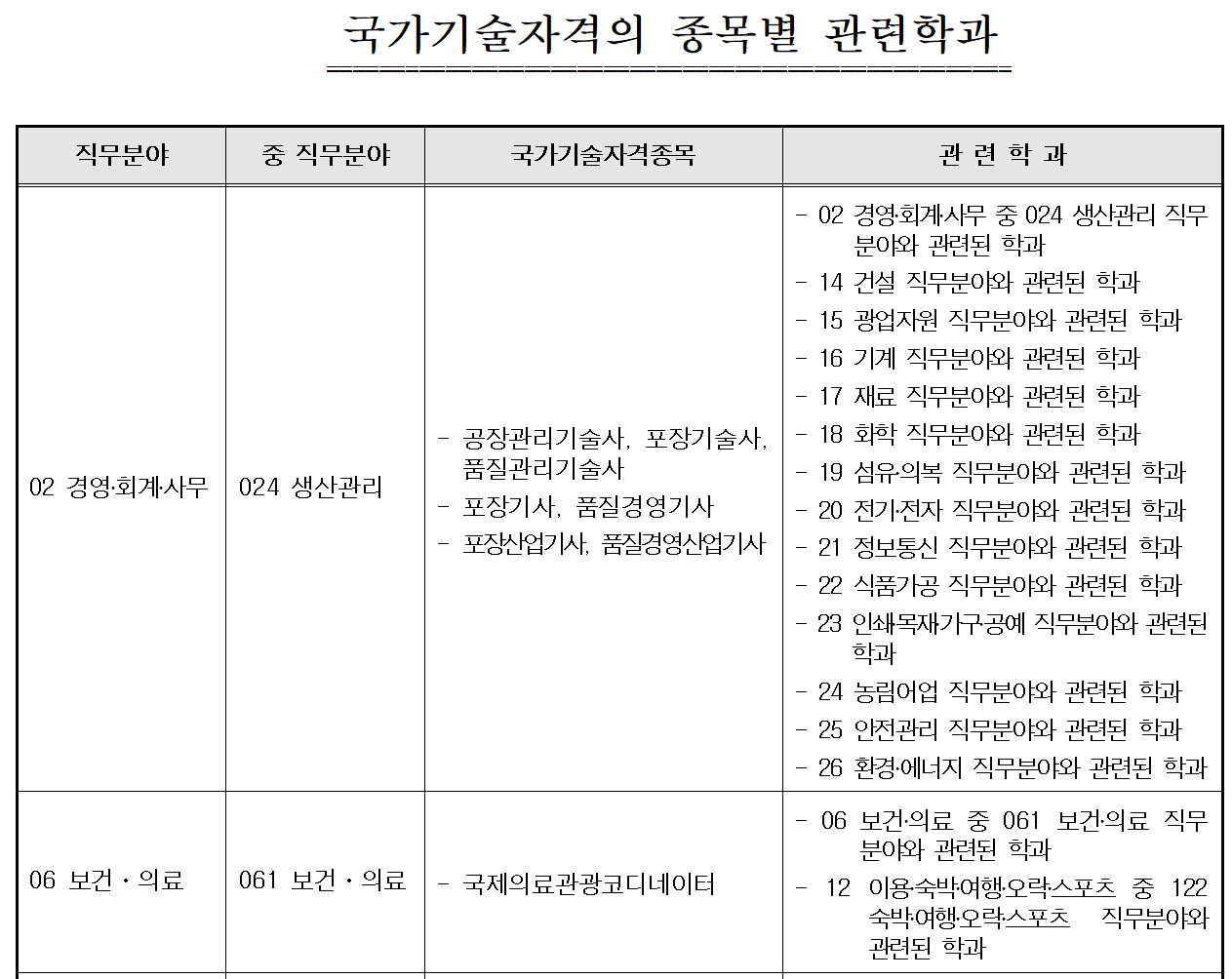 별표 1에서 검색하면 관련학과가 '02 경영·회계·사무 중 024 생산관리 직무 분야와 관련된 학과'와 같이 나오기 때문에 다시 직무 분야별 학과를 찾아야 하는데요. 이는 아래 표와 같이 생긴 고용노동부고시인 '국가기술자격의 종목별 관련학과 고시' 별표 2를 봐야 알 수 있습니다. 파일을 첨부하니 다운로드하여 관련학과를 검색해보시기 바랍니다.