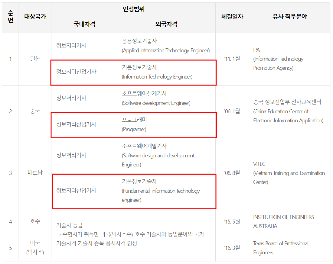 현재 외국에서 취득한 자격 중 산업기사 응시자격을 부여하는 자격은 아래 표와 같습니다.
