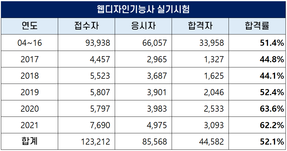이번 포스팅에서는 2022년에 시행된 1회, 2회, 3회, 4회 웹디자인기능사 필기 및 실기 시험 원서접수자, 응시자, 합격자 및 합격률에 대해 정리했습니다.