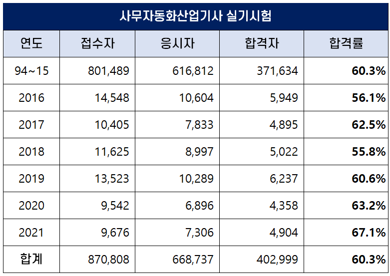 1994년부터 2021년까지 역대 사무자동화산업기사 실기 평균 합격률은 60.3%인데요. 최근 합격률이 높아져 2021년에는 67.1%의 높은 합격률을 기록하기도 했습니다.