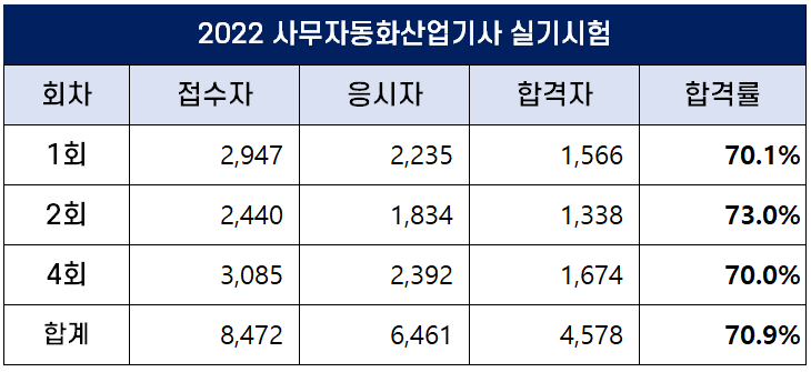 2022년 4회 사무자동화산업기사 실기 시험 합격률은 70.0%이고, 2022년 평균 합격률은 70.9%입니다.