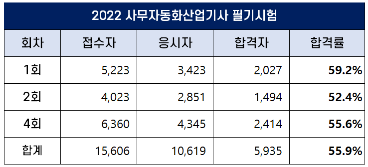 이번 포스팅에서는 2022년에 시행된 1회, 2회, 4회 사무자동화산업기사 필기 및 실기 시험 원서접수인원, 응시인원, 합격인원 및 합격률에 대해 정리했습니다.