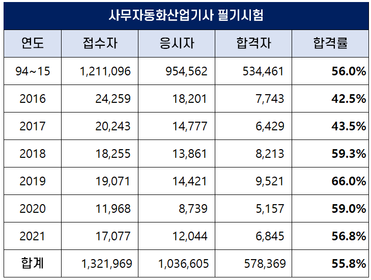 아래표는 사무자동화산업기사가 시행된 1994년부터 2021년까지 역대 사무자동화산업기사 필기시험 합격률인데요. 평균 합격률은 55.8%이나 2019년에는 66.0%의 높은 합격률을 기록했습니다.