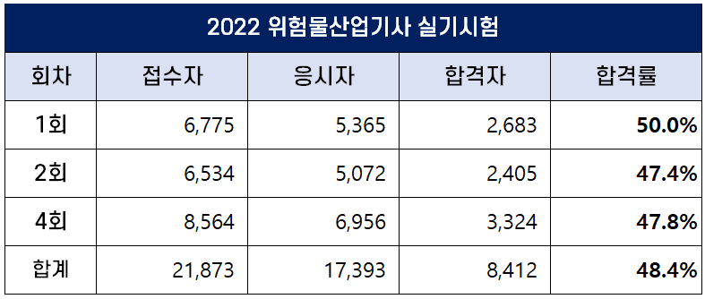 이번 포스팅에서는 2022년에 시행된 1회, 2회, 4회 위험물산업기사 필기 및 실기 시험 원서접수인원, 응시인원, 합격인원 및 합격률에 대해 정리했습니다.