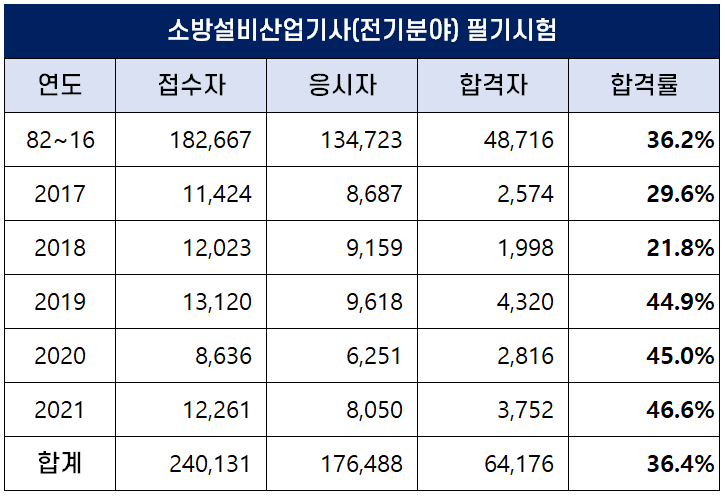 아래 표는 소방설비산업기사(전기분야) 차격시험이 처음 시행된 1982년부터 2021년까지 역대 소방설비산업기사(전기분야) 필기시험 접수자, 응시자, 합격자 및 합격률인데요. 평균 합격률은 36.4%이나 최근 합격률이 높아져 2020년에는 45.0%, 2021년에는 46.6%의 높은 합격률을 기록했습니다.
