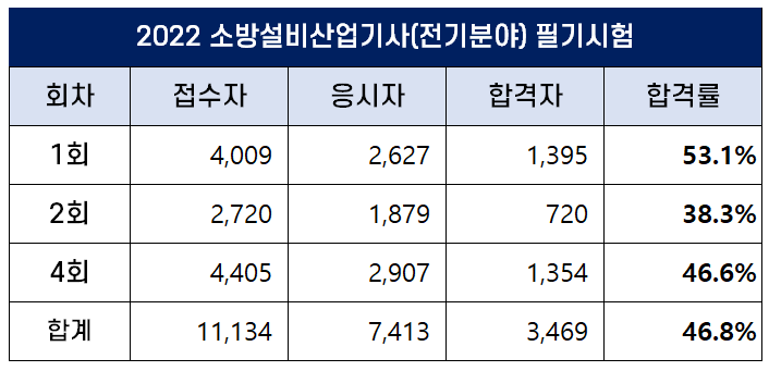 2022년 4회 소방설비산업기사(전기분야) 필기시험 합격률은 46.6%입니다.