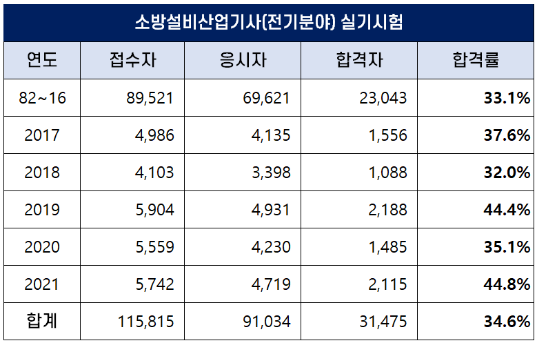 역대 소방설비산업기사(전기분야) 실기 평균 합격률은 34.6%인데요. 2021년에는 44.8%의 높은 합격률을 기록하기도 했습니다.