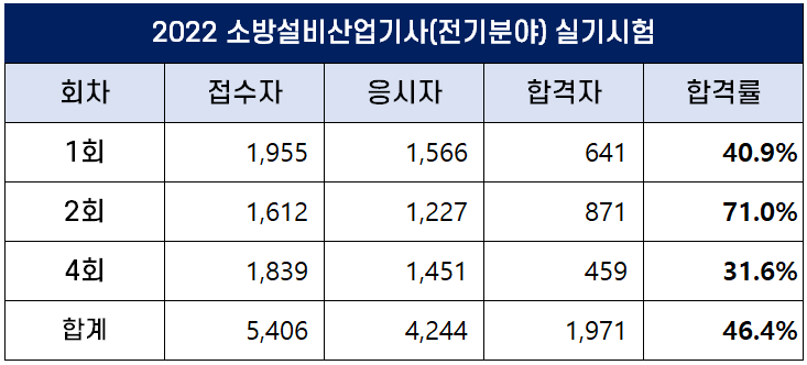 2022년 소방설비기사(전기분야) 합격률 (1회, 2회, 4회 실기 및 필기)
