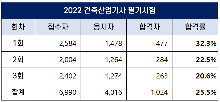 아래 표에서 보는 것처럼 2022년 건축산업기사 필기시험에는 총 6,990명이 원서접수를 했는데요. 이 중 4,016명이 필기시험에 응시했고 1,024명이 합격을 해 평균 합격률은 25.5%입니다.